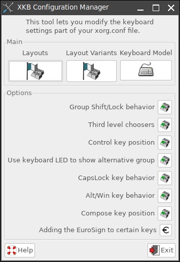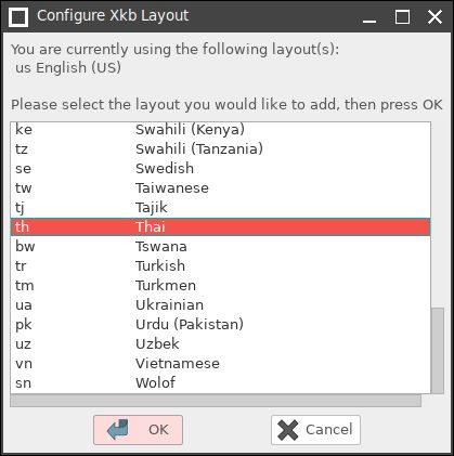 - ปรากฏ XKB Configyration Manger ในกรอบ Main เลือก Layouts